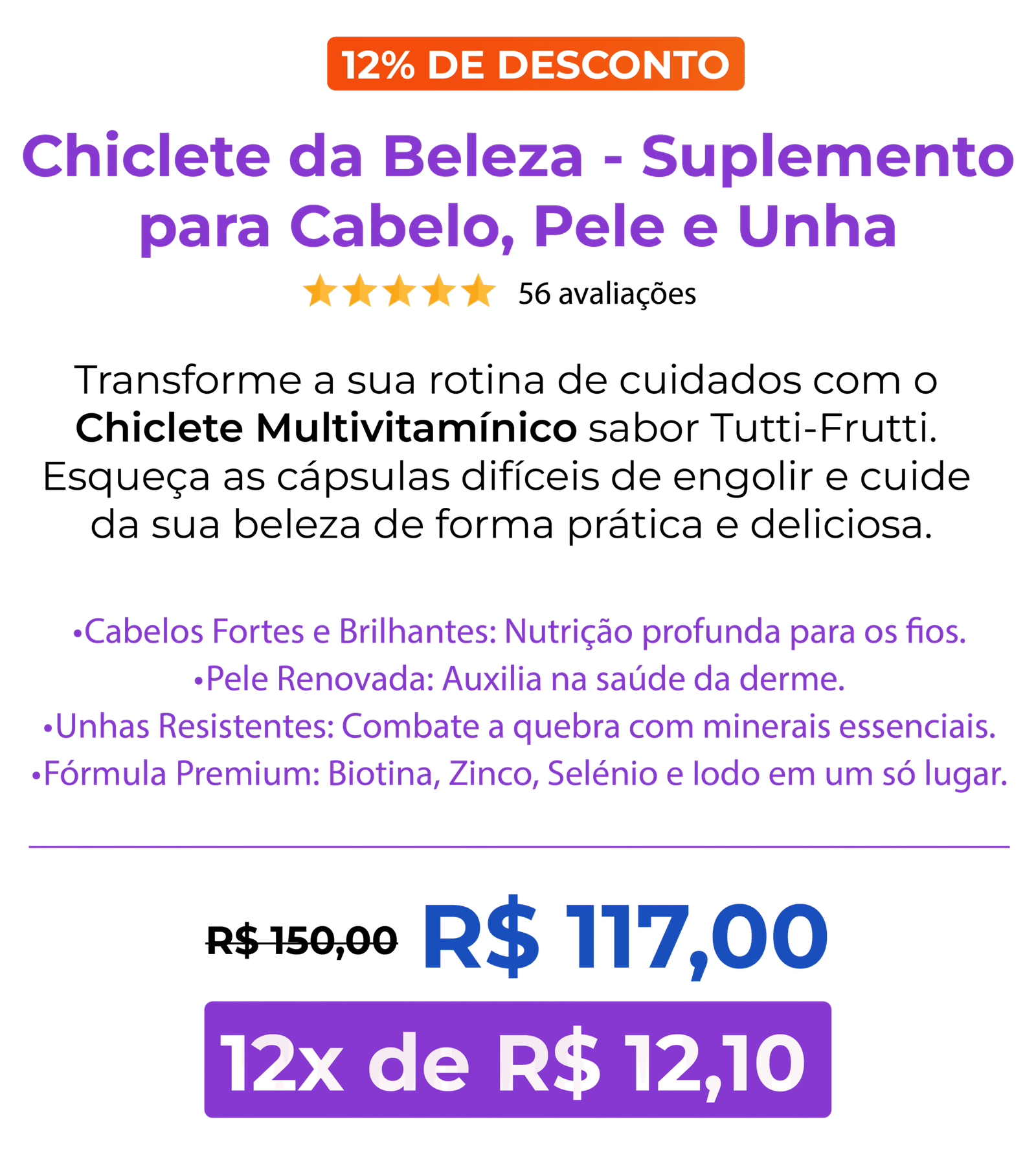 Use o #chicletedabeleza por 30 dias completos e acompanhe a evolução nos fios, mais fortes, menos queda, unhas mais resistentes e aparência mais saudável.